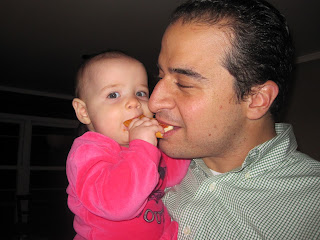 Josh Caitlyn and I had been out at an event for dinner this night...where Caitlyn ate a lot. We get home about the same time and Jared was eating some leftover pizza. Caitlyn decided it was hers and proceeded to eat the whole piece. She's no longer happy with what is on her tray in her high chair, just wants what we are eating!